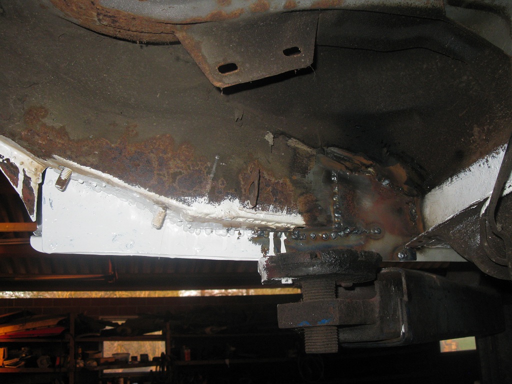 Leider war ich in den letzten Tagen etwas kniepig, was das Fotos machen anbelangt. Aber ich war durchaus fleißig. Die Achsaufnahme links ist wieder anmodelliert. Die verrosteten Stellen hatte ich ja schon herausgetrennt und mit Rostschutz beabeitet. Aufgeschweißt habe ich das alles mit 2mm dickem Stahlblech. DAS rostet so schnell nicht wieder durch. Außerdem gibt es mir die nötige Stabilität. Kann ja nicht schaden, wenn es etwas stabiler ist als im Original.