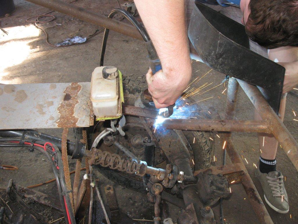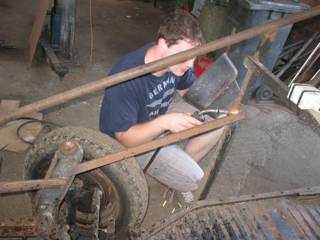 Noch ne Kleinigkeit am Rande, eigentlich wollt ich nur ne Mutter nachziehen die sich am rechten Stoßdämpfer vorn gelöst hat. Wie es kommen mußte kam es auch, ein-zwei kleine Drehungen und schon war der Gewindebolzen ab, Klasse. Aber nicht unlösbar. Gerade abflexen, neues Loch bohren und Gewinde schneiden. „Einmal mit Profi´s arbeiten“ war dann der erste Kommentar als Frank das gesehen hat. Das letzte Bild zeigt wieso. 😉