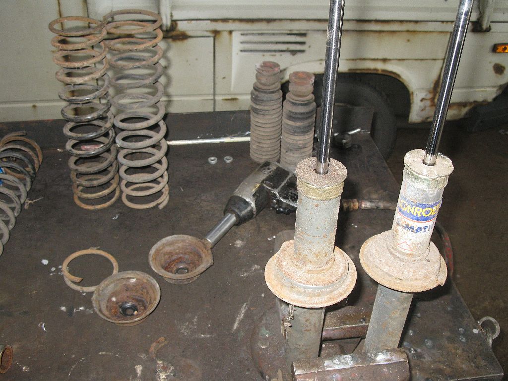 Die Federbeine hab ich dann beide noch zerlegt und die Dämpfer gecheckt. Die sind damals erst kurz vor Abmelden noch mal neu gekommen, die Monroe-Aufkleber sind sogar noch drauf. Geprüft und für gut befunden. Keinerlei Luft, und die Kolbestangen fahren noch selbstständig und zügig aus. Wenigstens etwas.