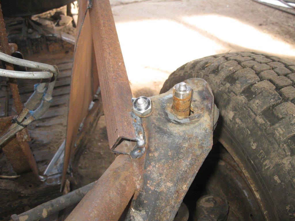 Noch ne Kleinigkeit am Rande, eigentlich wollt ich nur ne Mutter nachziehen die sich am rechten Stoßdämpfer vorn gelöst hat. Wie es kommen mußte kam es auch, ein-zwei kleine Drehungen und schon war der Gewindebolzen ab, Klasse. Aber nicht unlösbar. Gerade abflexen, neues Loch bohren und Gewinde schneiden. „Einmal mit Profi´s arbeiten“ war dann der erste Kommentar als Frank das gesehen hat. Das letzte Bild zeigt wieso. 😉
