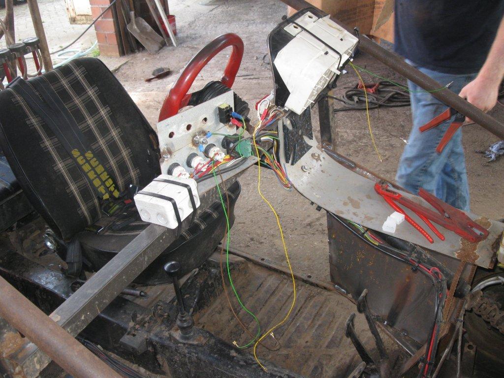 Sers, wie einige ja wissen hatten wir schon mal vor gegen ein paar Jungs mit nem selbst geschlüsselten Quad anzutreten und ein paar Runden auf´m Acker zu heizen. Dafür brauchte das Kart aber noch ein bisschen Feintuning, ich hab nen Cockpit organisiert, Frank ne Heizung, und wo wir grad am Wasserkreislauf bei waren flog das Thermostat gleich mit raus. Einige werden sich fragen, nen Cockpit, wieso das. Ausser ein paar Info´s wie Batterieladezustand, zu heißer Motor und zu wenig Öldruck hatten wir nix was wir vom Zustand des Motors während der Fahrt wußten. Ein Drehzahlmesser wäre doch da was feines dachten wir uns, und wie gehabt kann man die für gutes Geld überall kaufen, das liegt aber nicht in unserer Natur, vom Geld mal abgesehen. Was machen? Beim freundlichen Auktionshaus des Vertrauens so´n paar Cockpits beobachtet und im richtigen Moment zugeschlagen. Cockpit vom Ford Escort, passend zum Turbolader. 😉