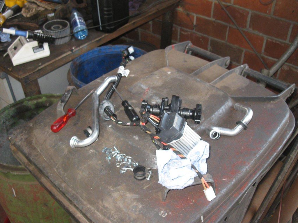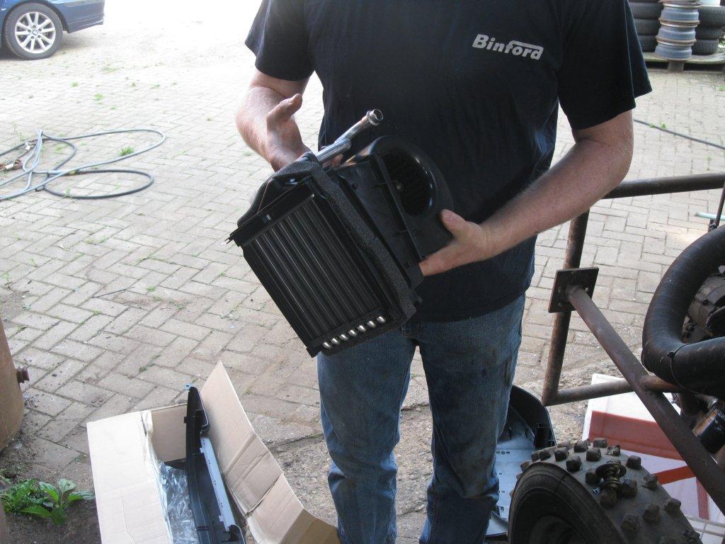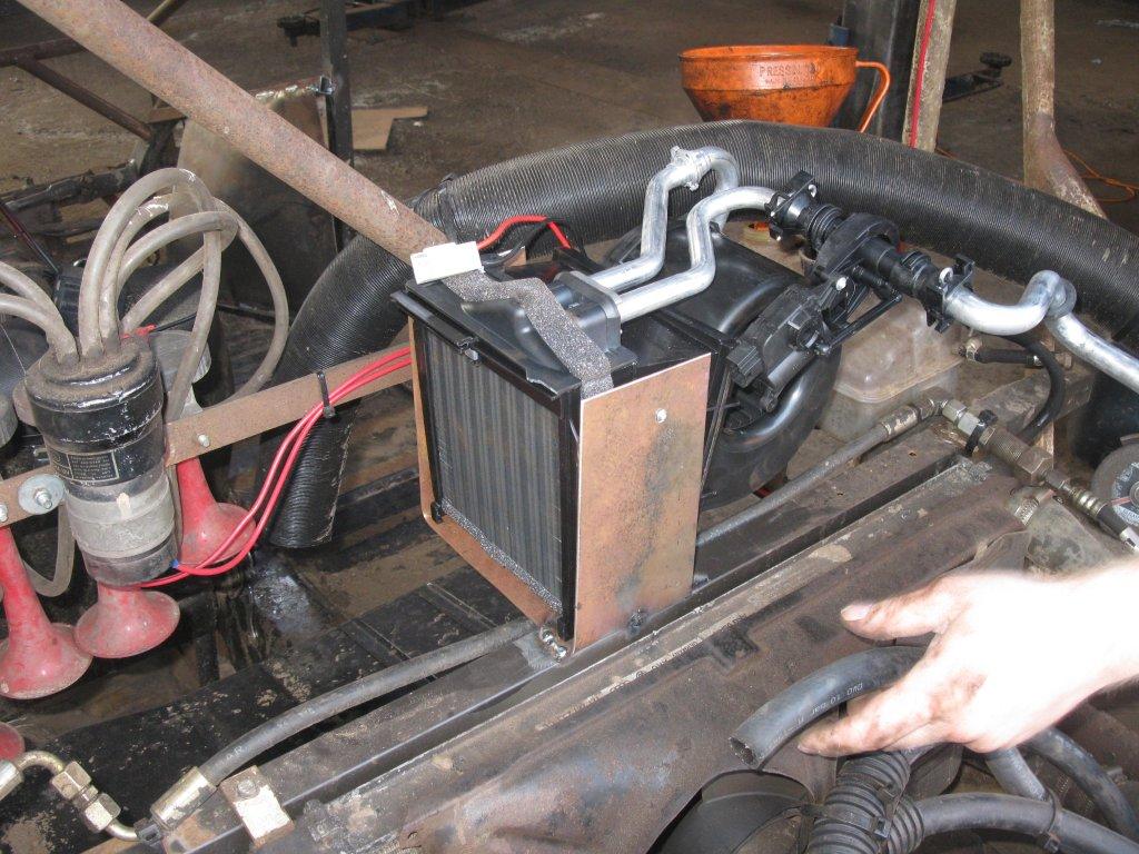 Weiter gings dann auch noch beim Kühlkreislauf. Im Sommer wird uns das Wasser zu warm und das Kart kocht recht fix. Als erstes flog da mal das Thermostat raus und da noch ne Heizung bei Frank über war haben wir die noch in den Kreislauf eingestrickt. Blech gebogen, angeschweißt, angeklemmt. Ganz einfach! Ist ja im Prinzip nix anderes wie der Kühler auch, ein Wärmetauscher. Wir haben quasi nur die Kühlerfläche vergrößert.