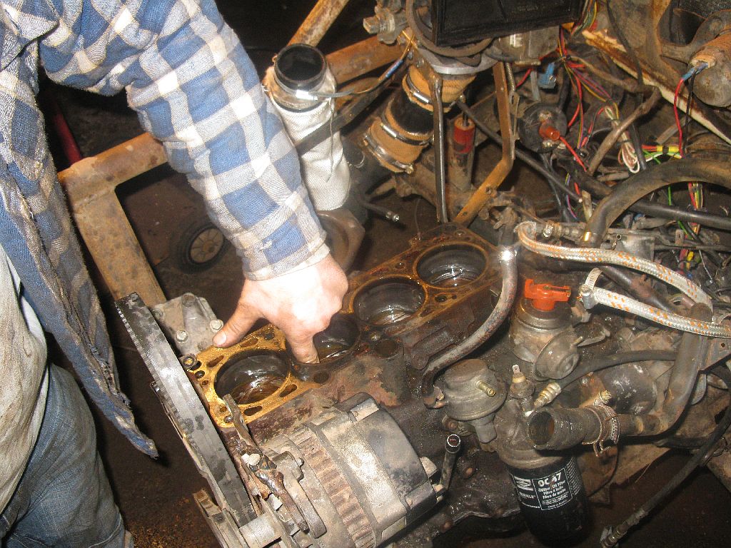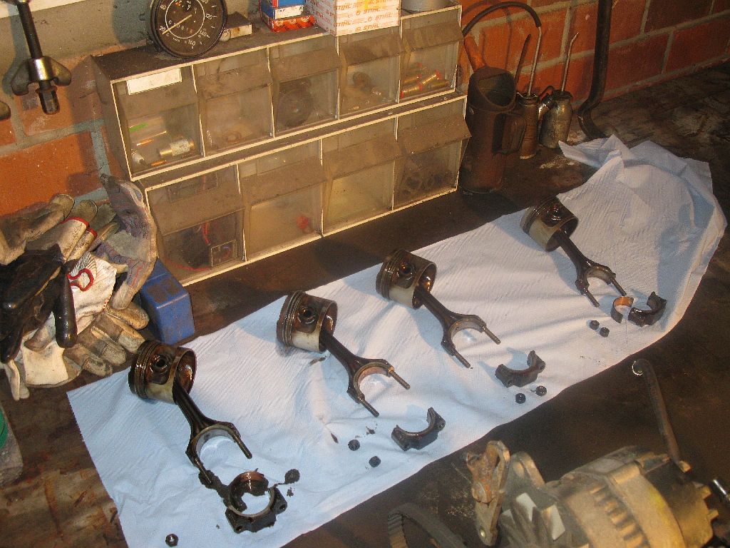 Dann ab mit dem Motor auf die Werkbank und Ölwanne drunter weg. Der Kopf war ja schon ab, also konnte sich gevatter Schuh sofort daran machen, die Kolben auszubauen. Schön säuberlich die Pleuellager geöffnet, den Kolben nach oben rausgedrückt und anschließend ordentlich aufgereiht. Dabei nach Möglichkeit keine der Lagerschalen verbummeln oder versaubeuteln.
